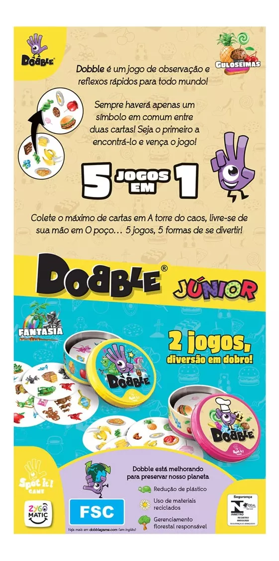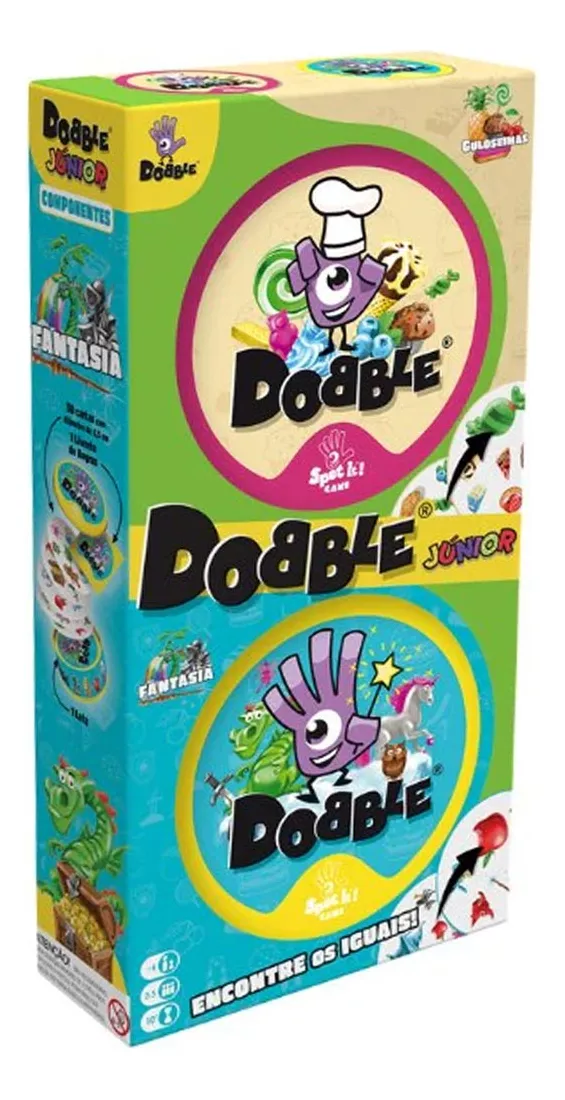 A linha Dobble infantil possui imagens voltadas para o universo dos pequenos, além de possuir menos cartas tornando o jogo mais simples. Dobble Junior é uma versão especial do jogo que virou um sucesso mundial – o jogo acompanha dois conjuntos de cartas com temáticas diferentes: guloseimas e fantasia. Um jogo de cognição e concentração que faz todos se divertirem e aprenderem ao mesmo tempo. Dobble é um divertido desafio de agilidade e observação!