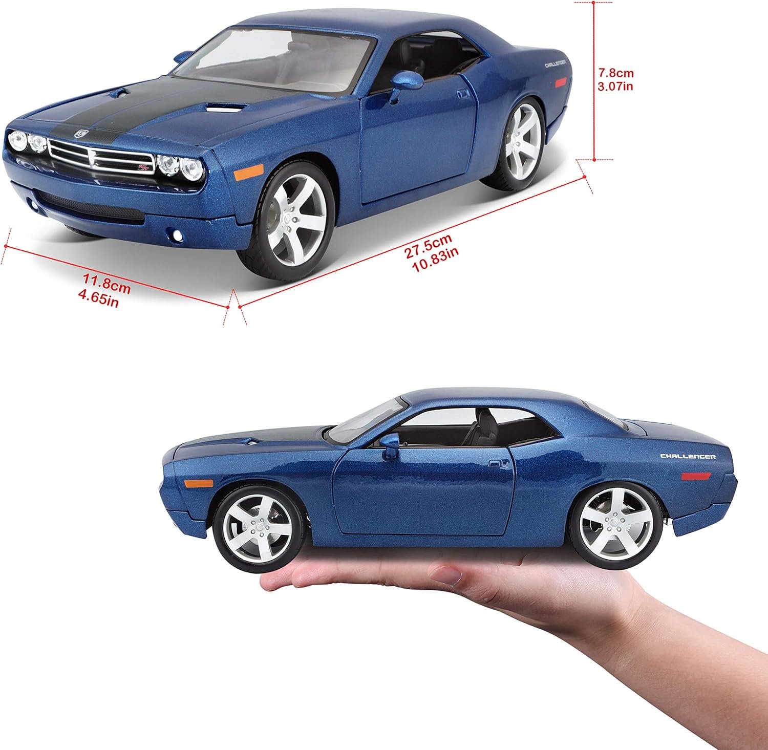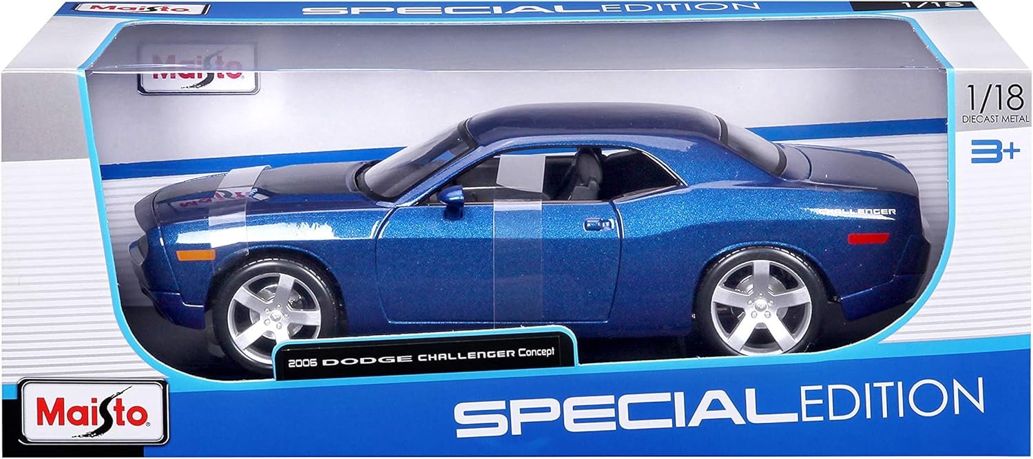 A miniatura de carro Dodge Challenger Concept de 2006 em escala 1/18 da Special Edition é fabricada em metal die-cast com acabamentos em plásticos, detalhamento fino na pintura, rodas livres e pneus de borracha.