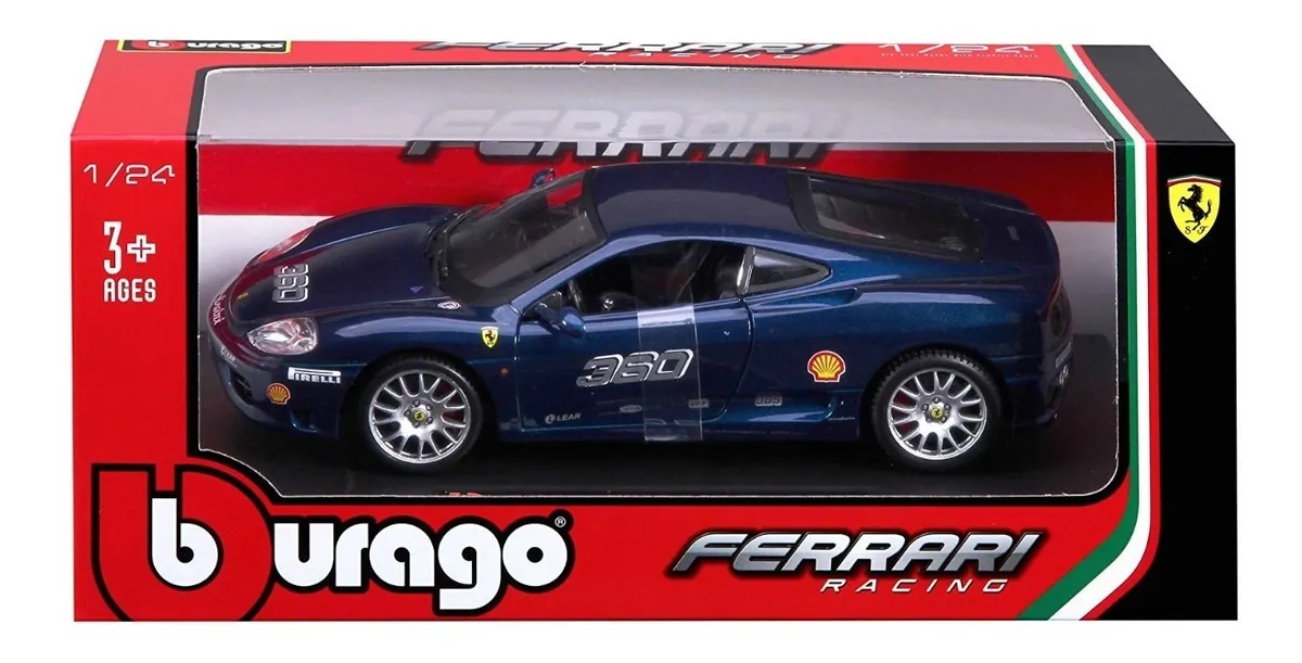 Miniatura Ferrari 360 Challenge Cor:Azul Miniatura fabricada em metal com partes em plástico Miniatura em escala 1:24, com com 19,0 C x 7,0 L x 5,0 A cm Portas abrem Rodas não esterçam acompanha base c/nome Embalagem:Caixa Individual Fabricante: Burago Excelente miniatura ,rica em detalhes de um grande clássico.